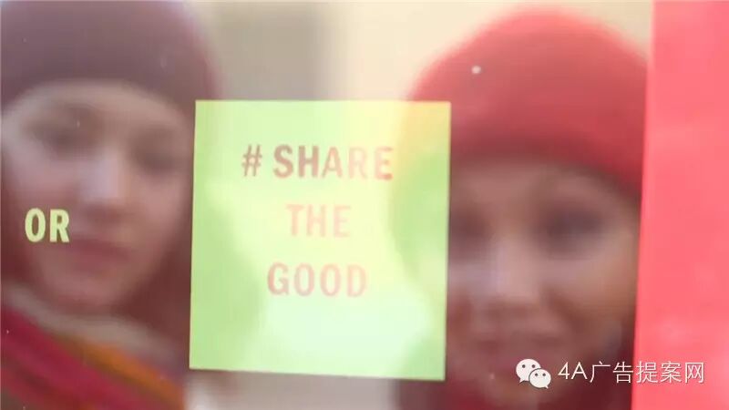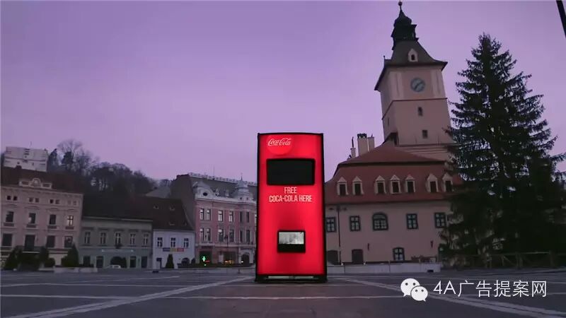 大多数人都选择免费的可乐,这时有一个女孩按下了「分享快乐」的选项。屏幕上上随即提示“抬头看”,这时神奇的事情发生了……