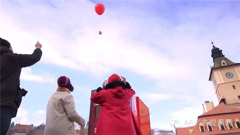 售货机的顶部一颗红色汽球缓缓飘出来,气球底下绑著一个小礼物,打开来还有一张小卡,要拿到气球的人继续分享这份喜乐,单纯的喜悦,分享让圣诞节更温馨。