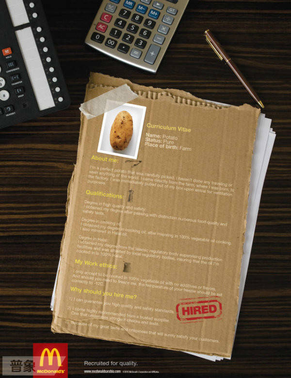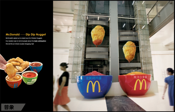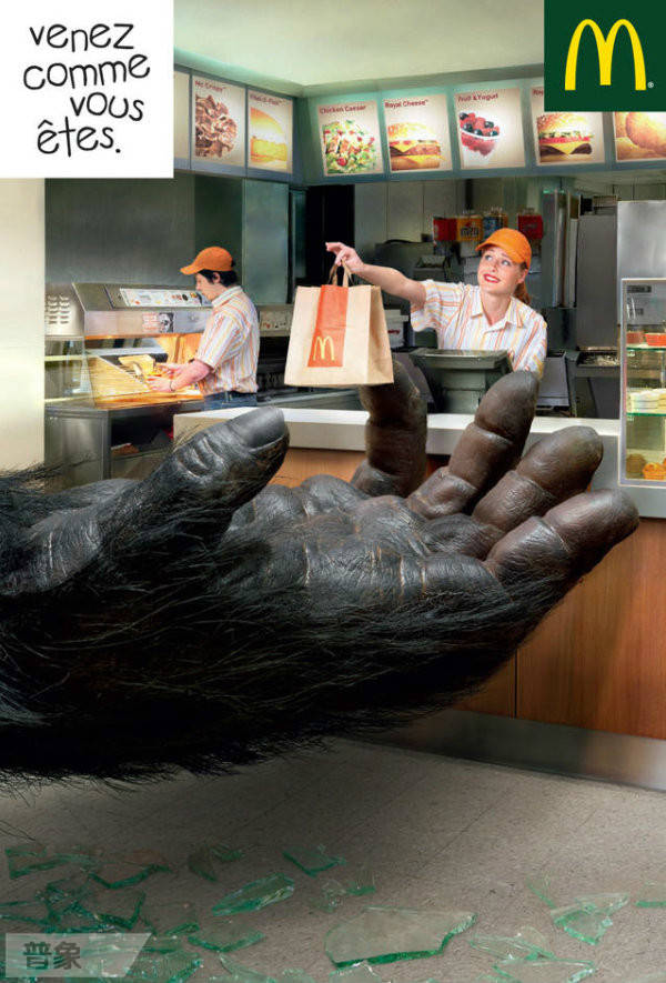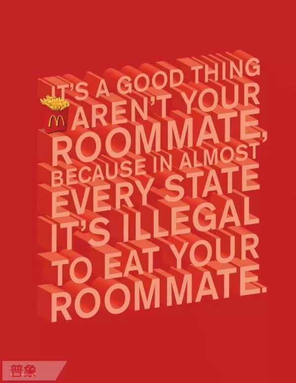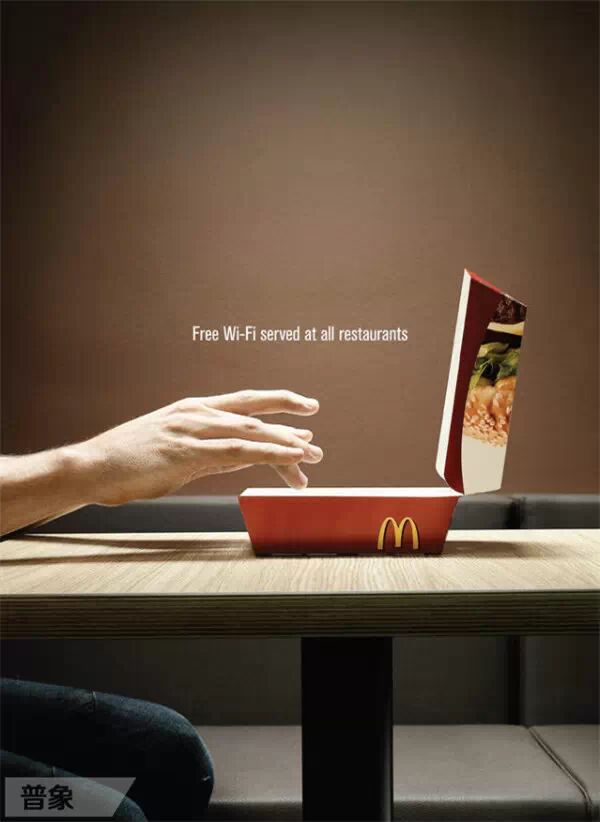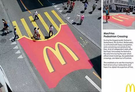 这是瑞士一间TBWA的广告公司为McDonald's设计的广告,厉害就是在于斑马线上的,红色的薯条袋,上面一个大大的黄M,一根根黄色的斑马线就像插在袋子里的薯条一样,如此过马路,你想不看都不行。