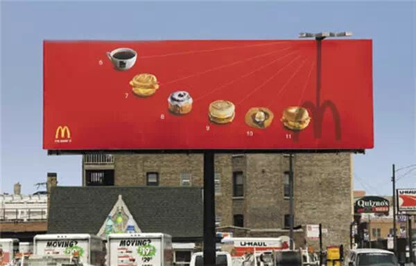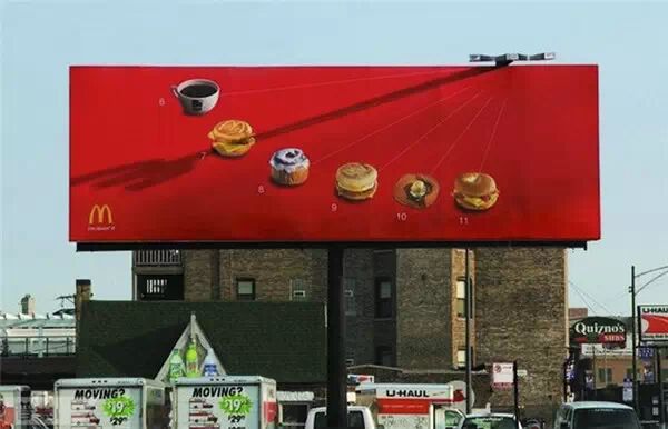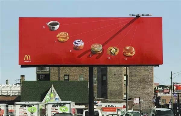 这个很酷的广告牌有个特征:一个真正的日晷!它的影子会落在不同的时刻供应食物上。