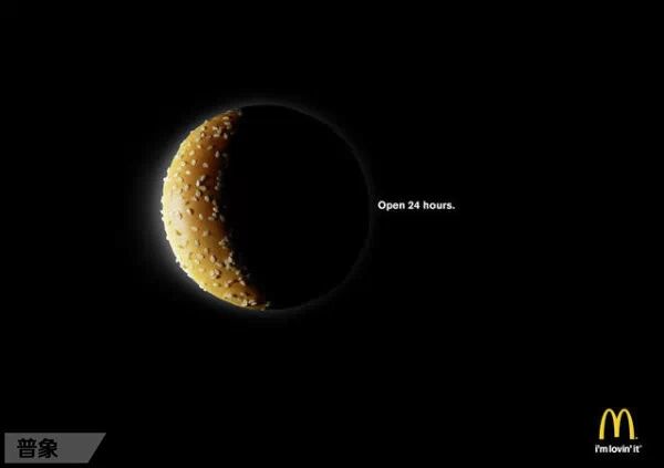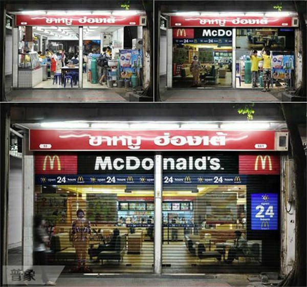由于每个餐馆都有自己的关闭休息时间。麦当劳将24小时服务的店面形象印在各种餐厅的卷帘门上。当门被拉低后,路人都会看到一个麦当劳24小时服务的形象。