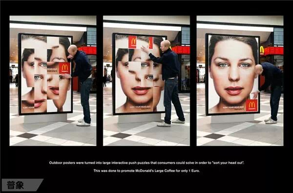 户外海报被变成大型的互动推推拼图,可供消费者娱乐,来“整理你的头”。这样做是为了在瑞典促销麦当劳那只需1欧元的大咖啡。