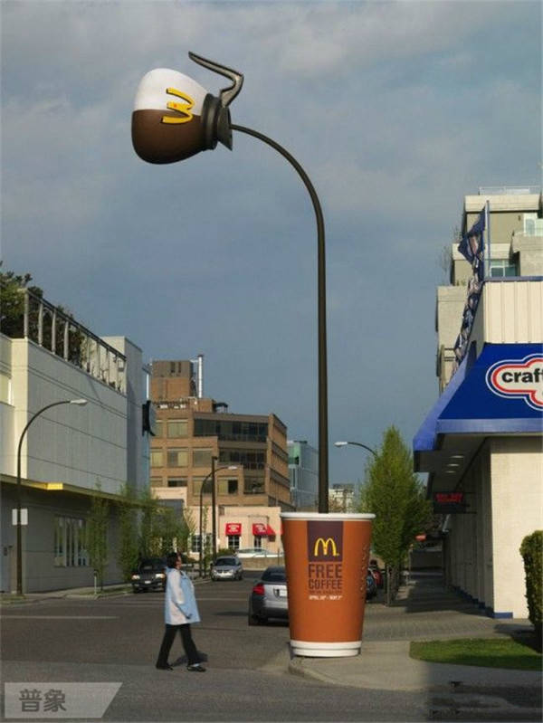 在温哥华市中心的灯柱形成了一种巧妙地的错觉,它看起来像在往人行道上的巨型杯子中倒入咖啡。