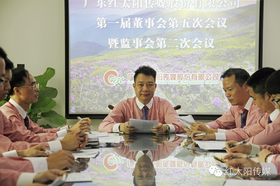 广东红太阳传媒股份有限公司第一届董事会第五次会议暨监事会第二次会议于2015年4月28日在公司会议室召开。出席会议董事5人,参加表决监事3人。会议由公司董事长陈亦文先生主持,公司其他高管人员列席会议。